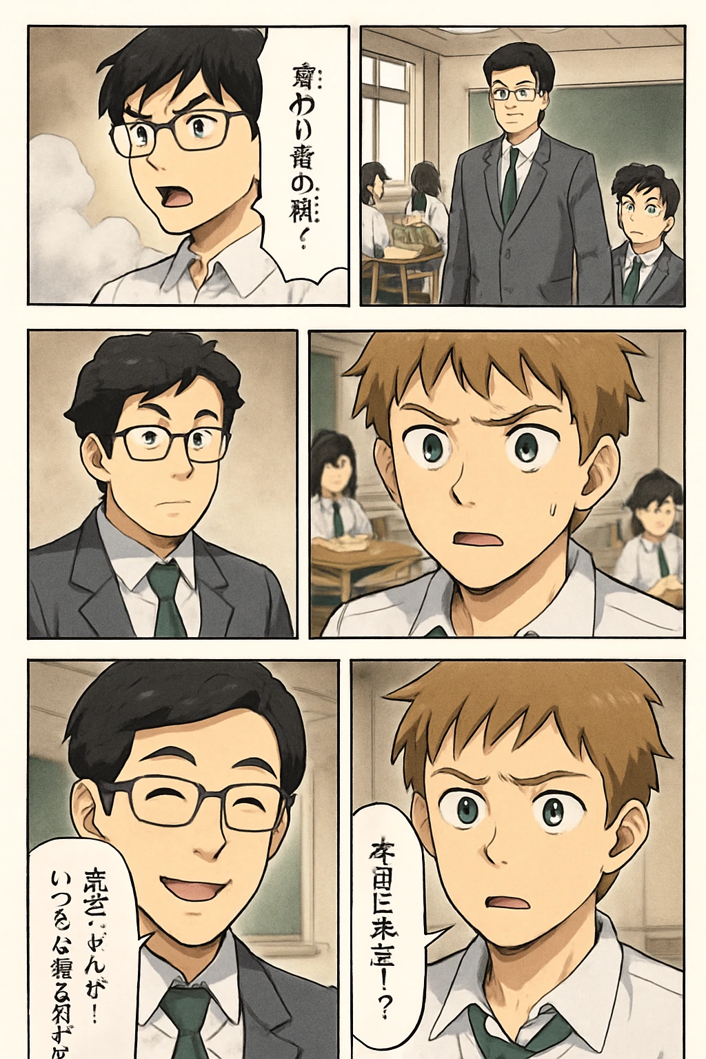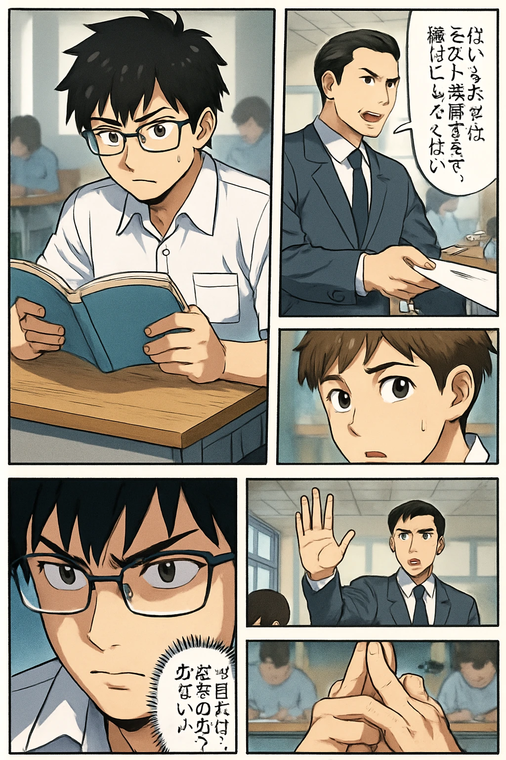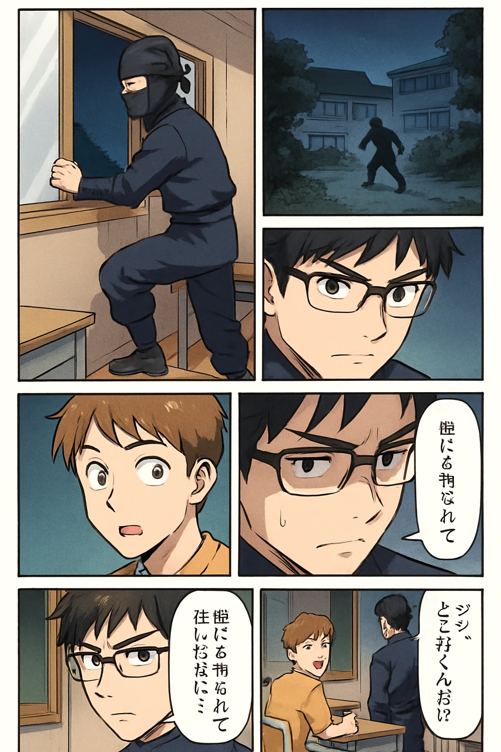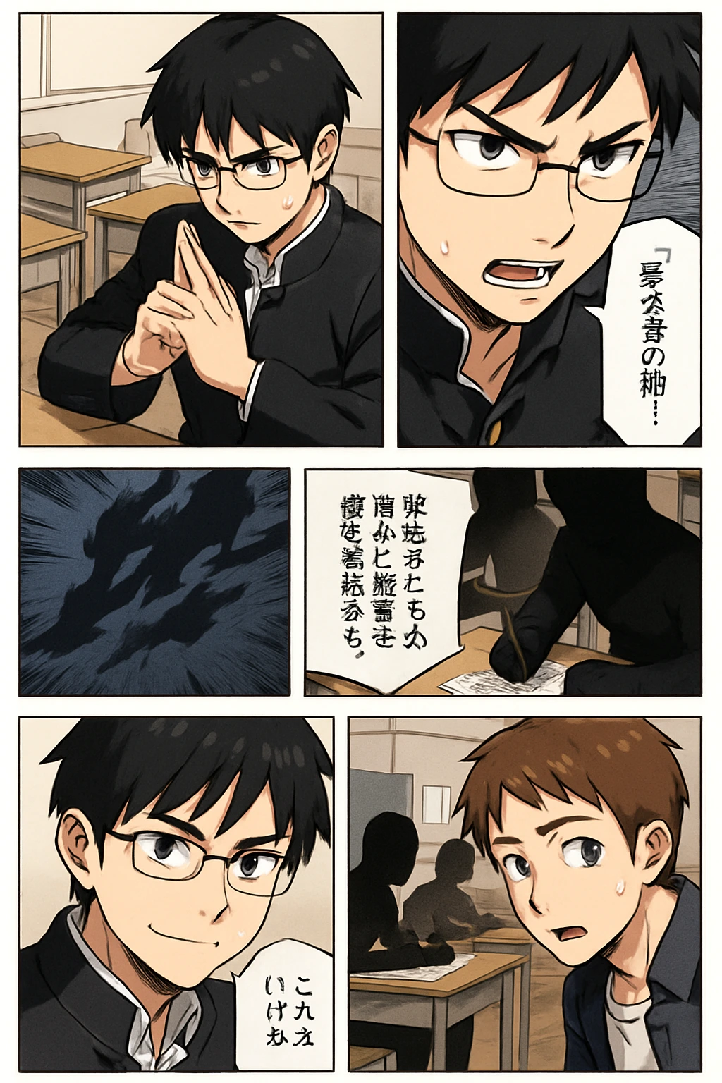 先生:『はい、それではテストを始めます。静かにしてください。』 ユウタ(小声):『ジン、大丈夫?顔色悪いよ。』 ジン(心の声):『今日だけは…忍者の力を使うしかない!』 教室が静まり、ジンが決意を固める。
