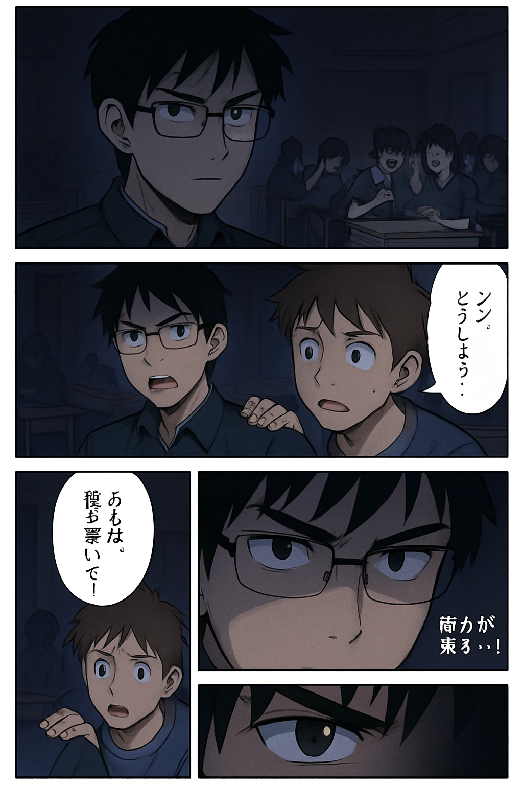 ユウタ:『ジン、どうしよう…』 ジン(心の声):『これはただの停電じゃない。何か来る…!』 ジン:『みんな、落ち着いて!』 ジンの瞳が鋭く光り、覚悟を決める。