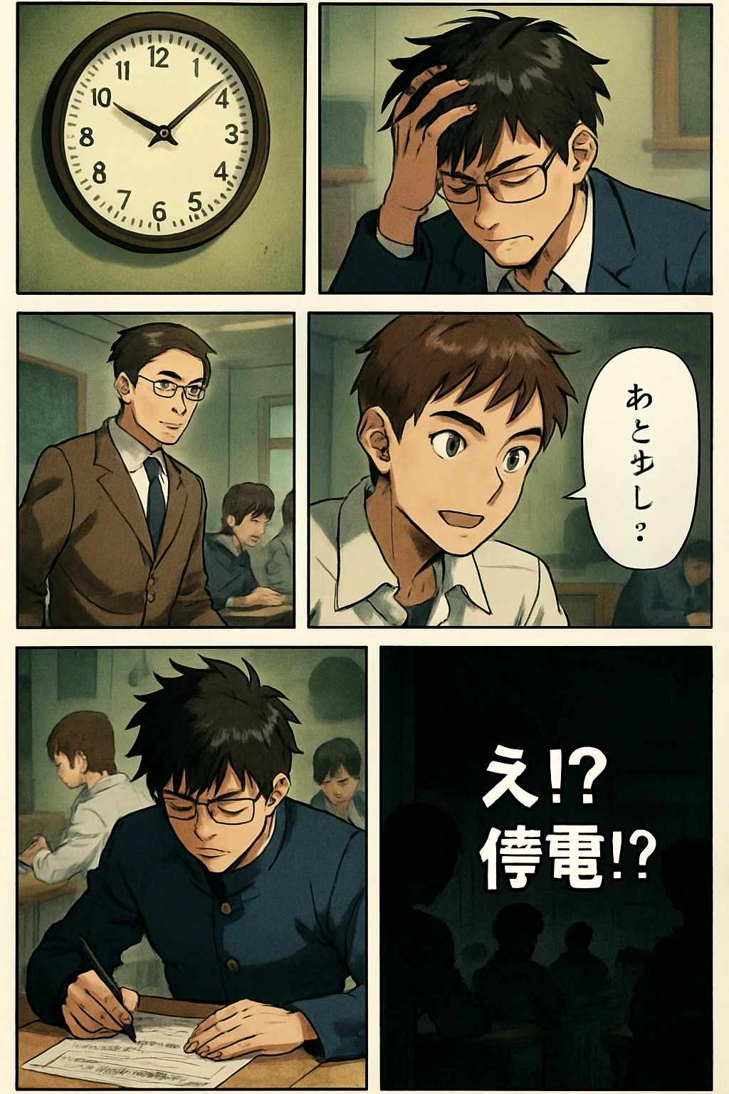 ユウタ:『ジン、もうすぐ終わるぞ!』 ジン(心の声):『あと少し…!』 突然、教室が真っ暗に。 生徒たち:『え!?』『停電!?』