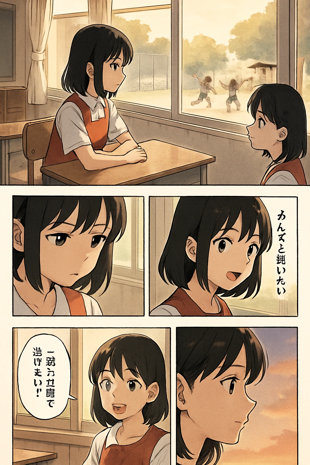 リナ「今日も一緒に遊ぼう!」 美咲「うん!」 (美咲・心の声)「私はもう、あのドアの向こうに怯えない。」