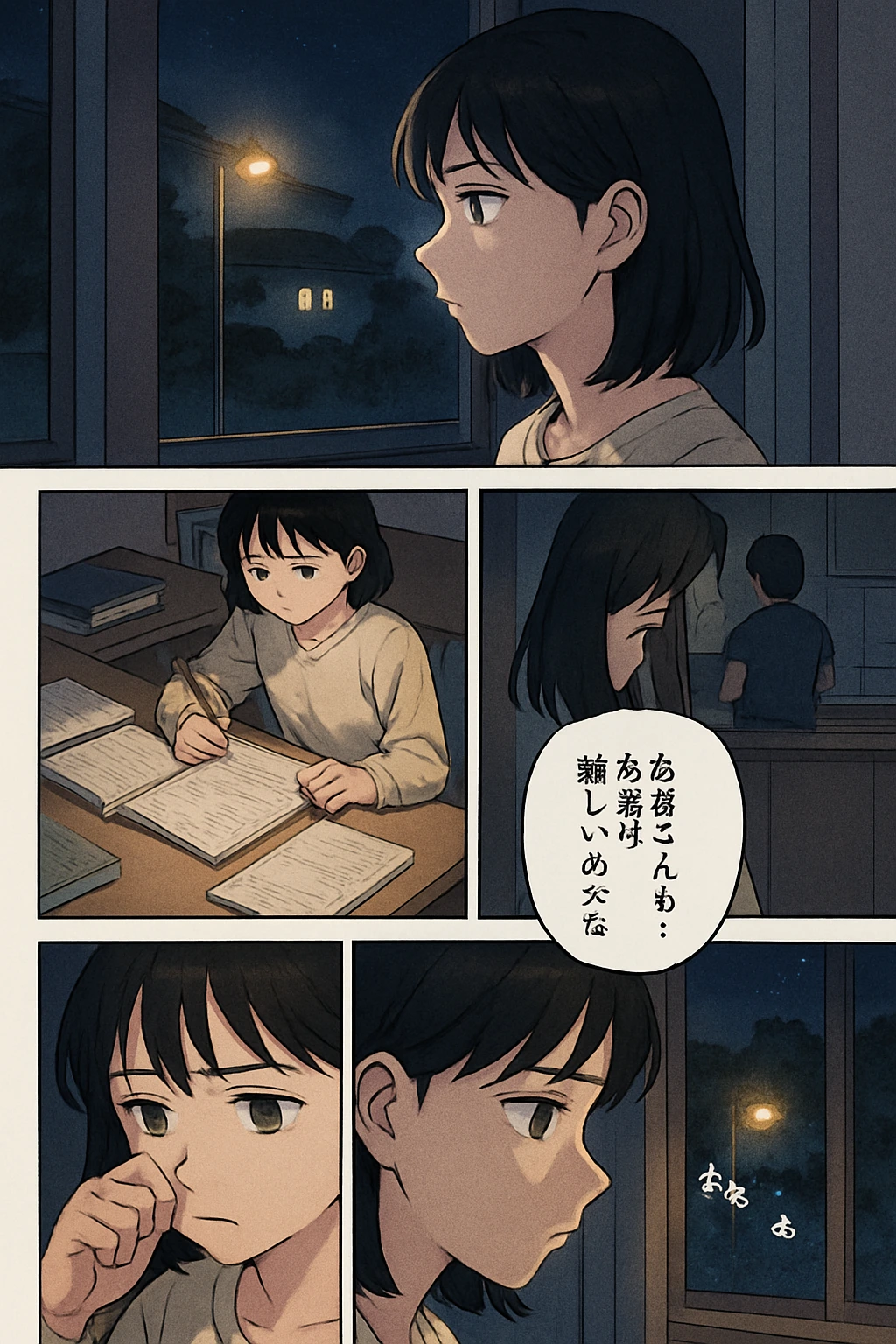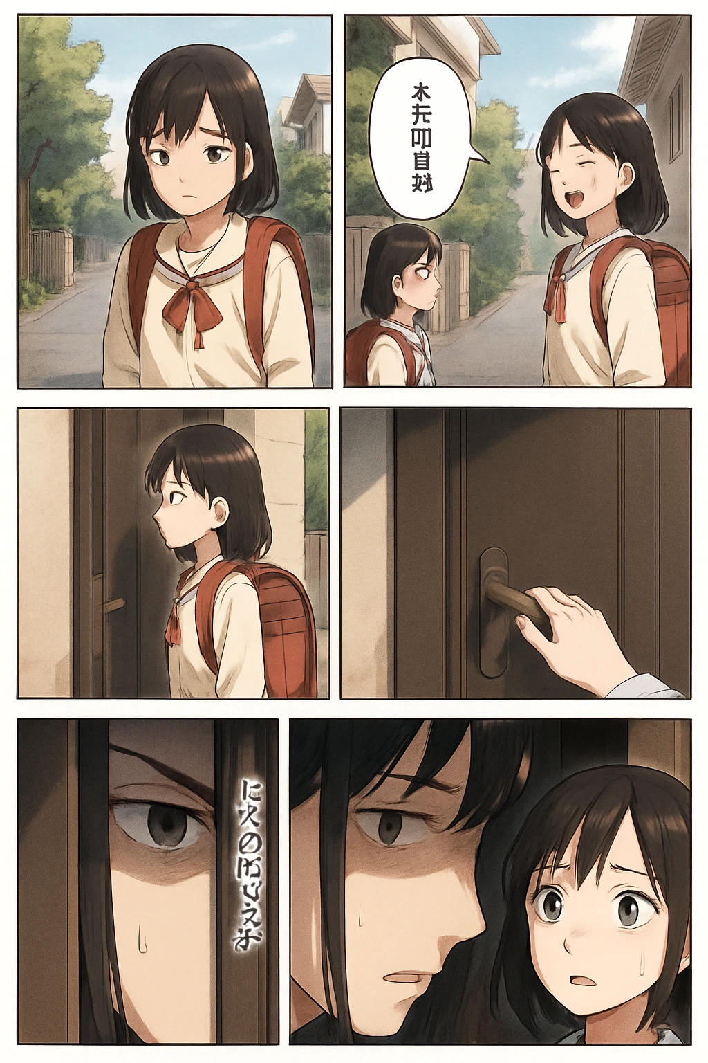リナ「また明日ね!」 美咲(小声)「うん…」 お母さん「どこ行ってたの?」 (美咲・心の声)「ドアの向こうが、すごく遠く感じる…」
