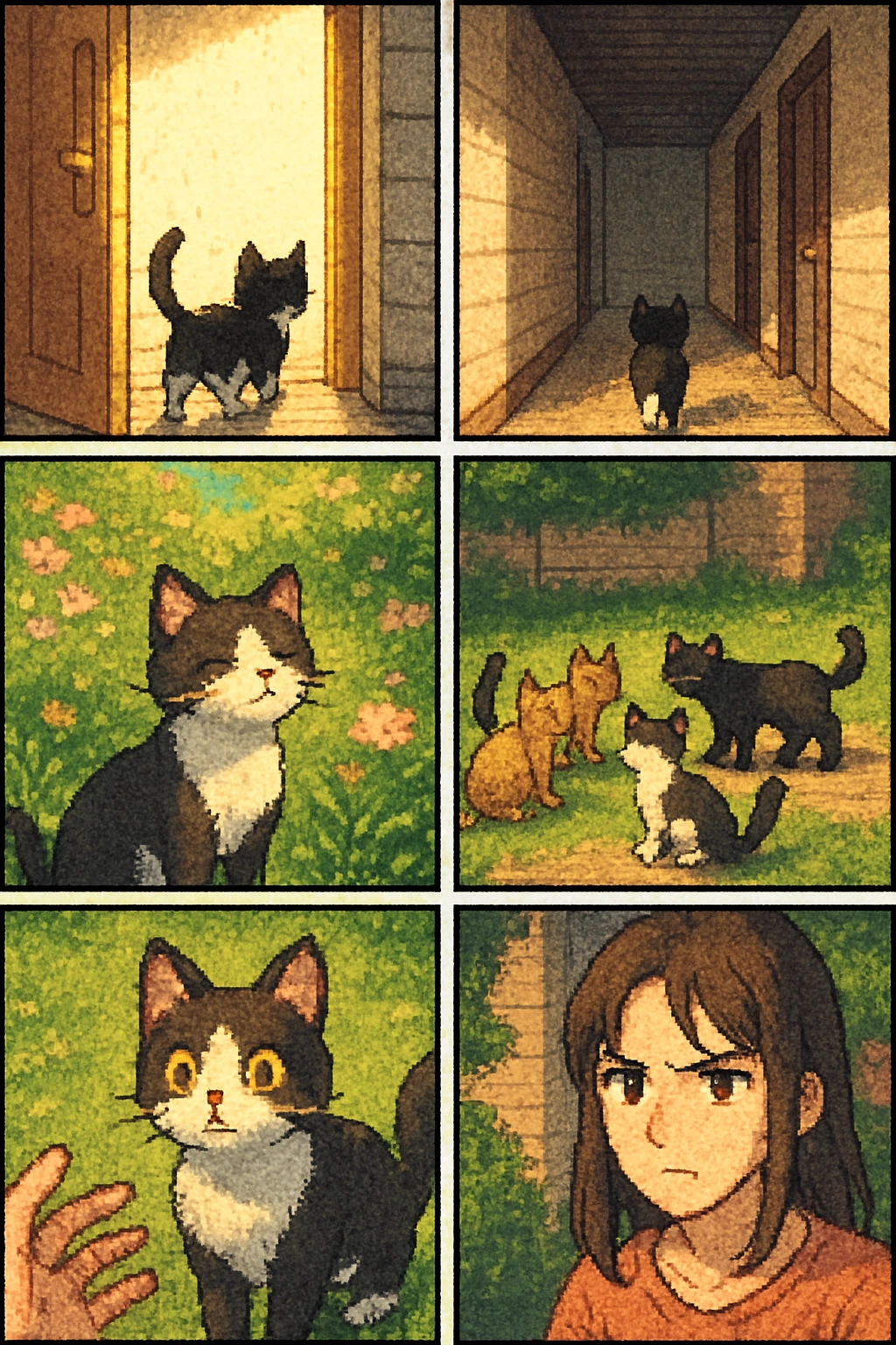 猫になった美咲は外の世界へ踏み出し、鮮やかな感覚に感動する。しかし、偶然かつての友人と出会い、思わぬ形で正体を疑われる。『……もしかして、美咲?』と声をかけられ、物語は新たな展開へ。