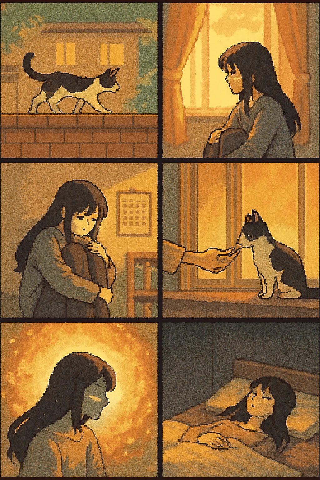 美咲は引きこもり生活の中で唯一、野良猫との小さな交流に癒やされている。『また来てくれたんだね……』と猫に微笑みかけ、夜、日々の繰り返しに戸惑いながら眠りにつく。だが、夢の中で不思議な光に包まれ、不安と期待が入り混じる。