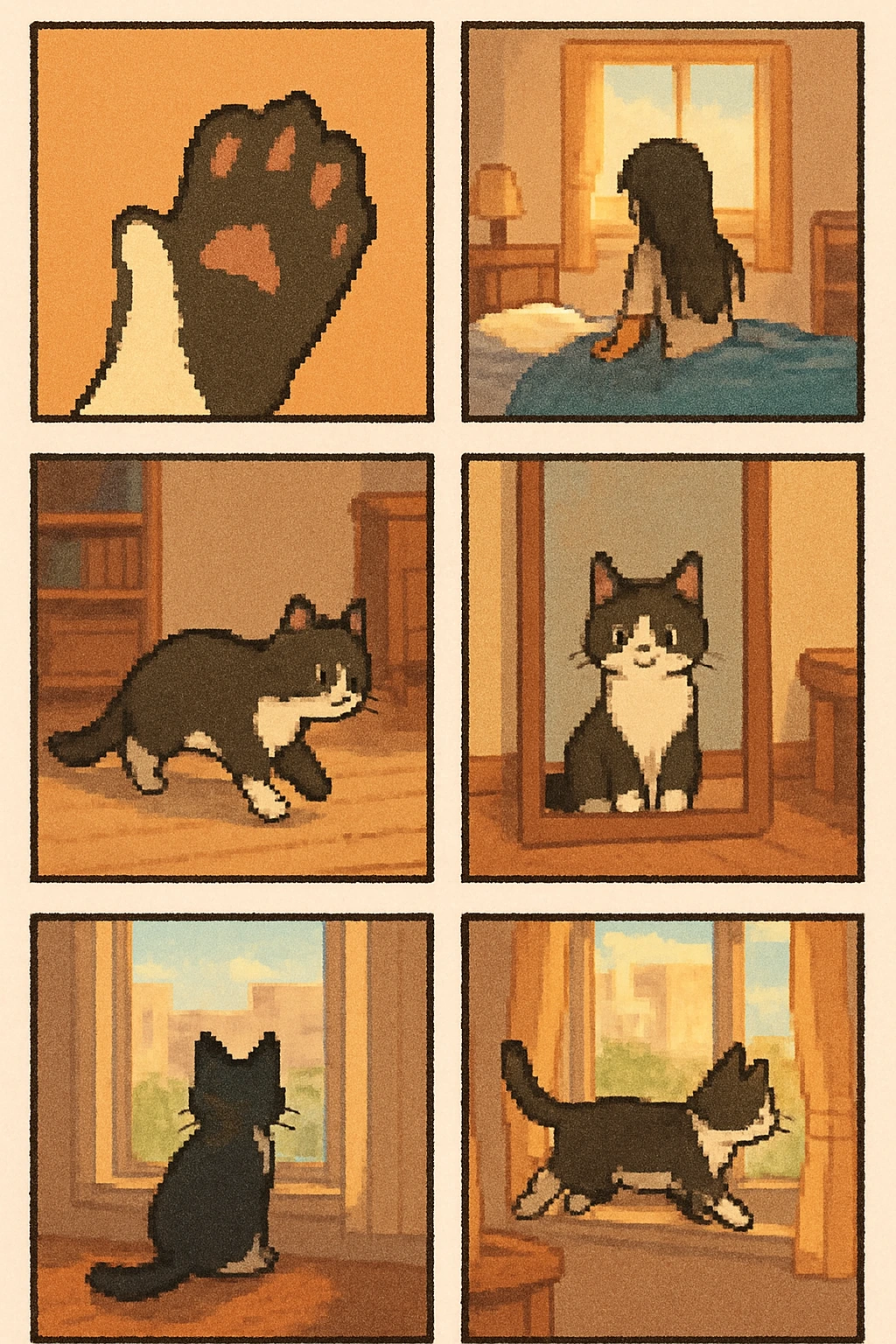 目覚めると猫になっていた美咲は混乱しながらも、新しい感覚や自由な動きに戸惑いと興奮を覚える。『私、猫になってる!?』と鏡に驚きつつ、窓辺から外の世界を見つめる。