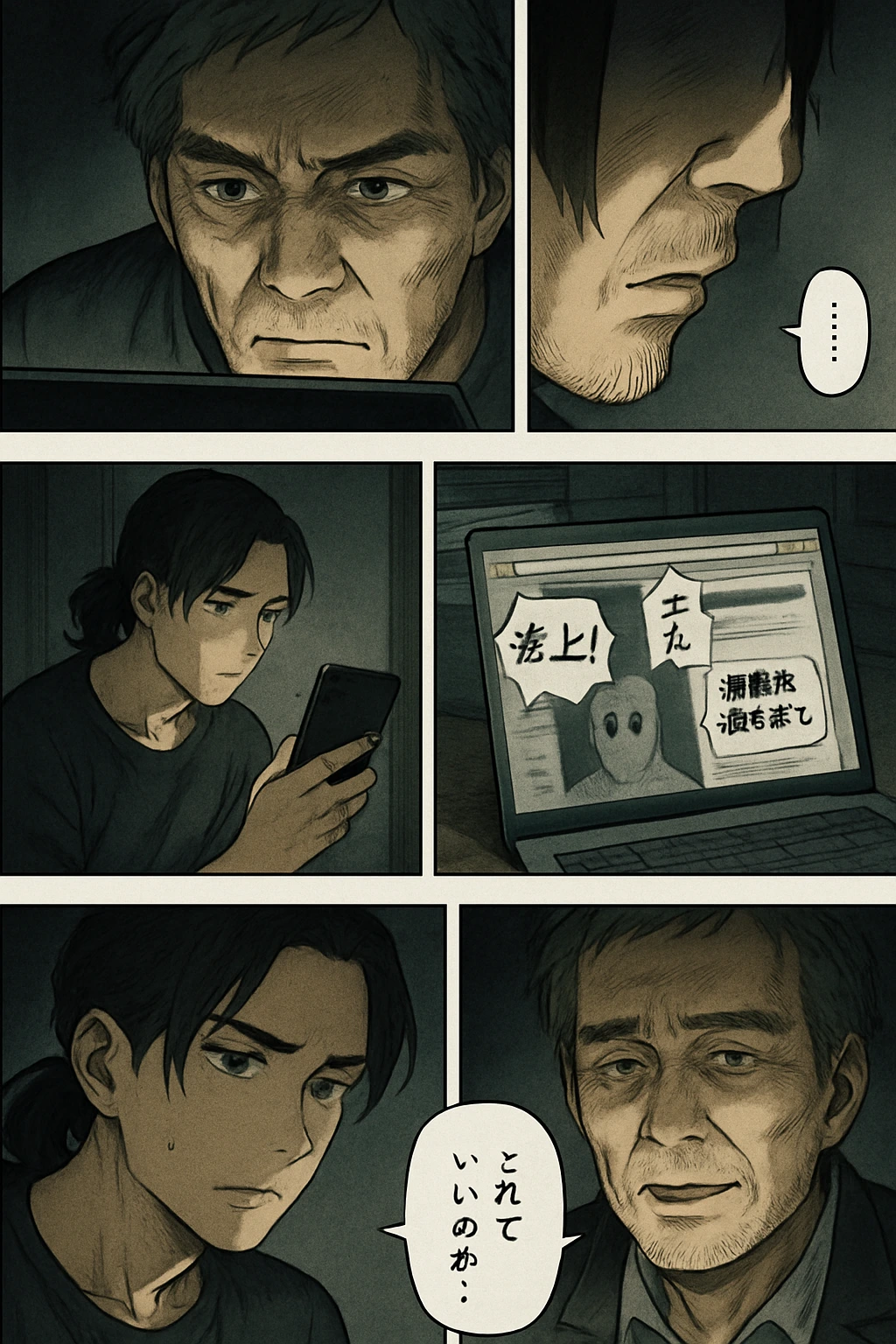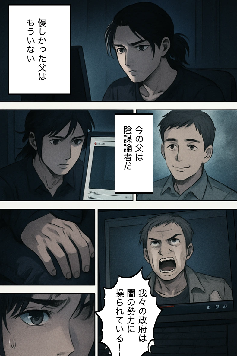 渉(モノローグ):『あの頃の父には、もう戻れない。でも…』 SNSコメント:『隆司さん、あなたの話は真実だ!』 渉:『俺がやるしかない…』
