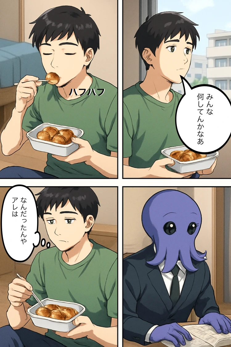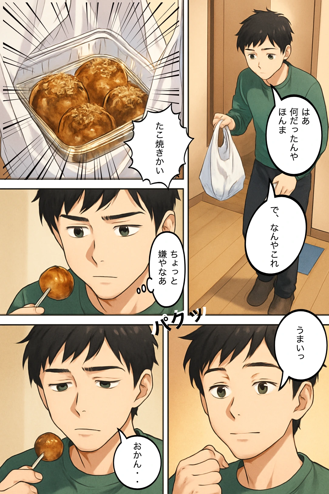 健斗(モノローグ)「え、たこ焼き…?これって…」 健斗(内心)「まさか…いや、考えすぎやろ…」 健斗「いただきます…」 一口食べて「…うまっ、懐かしい味や」