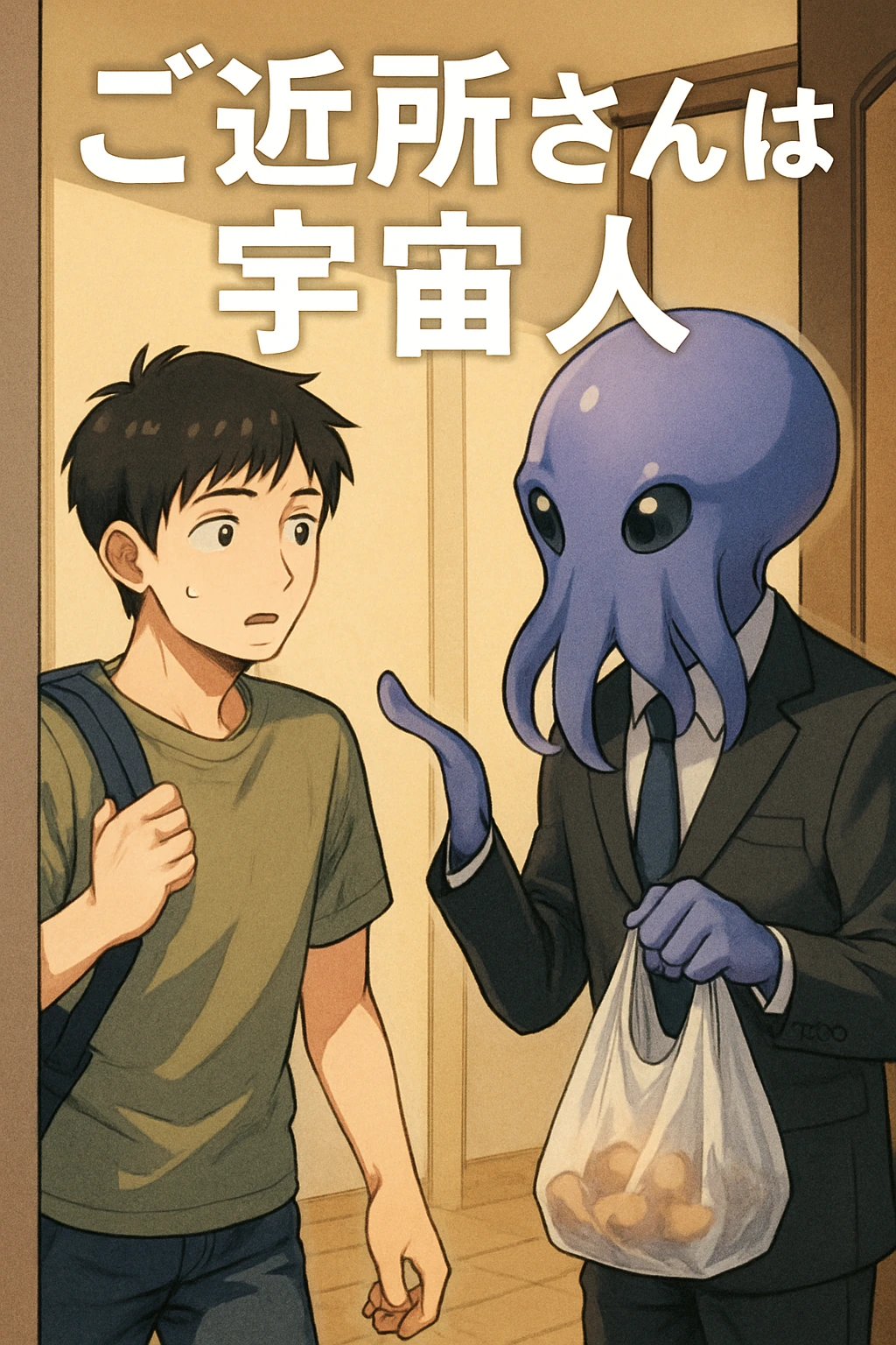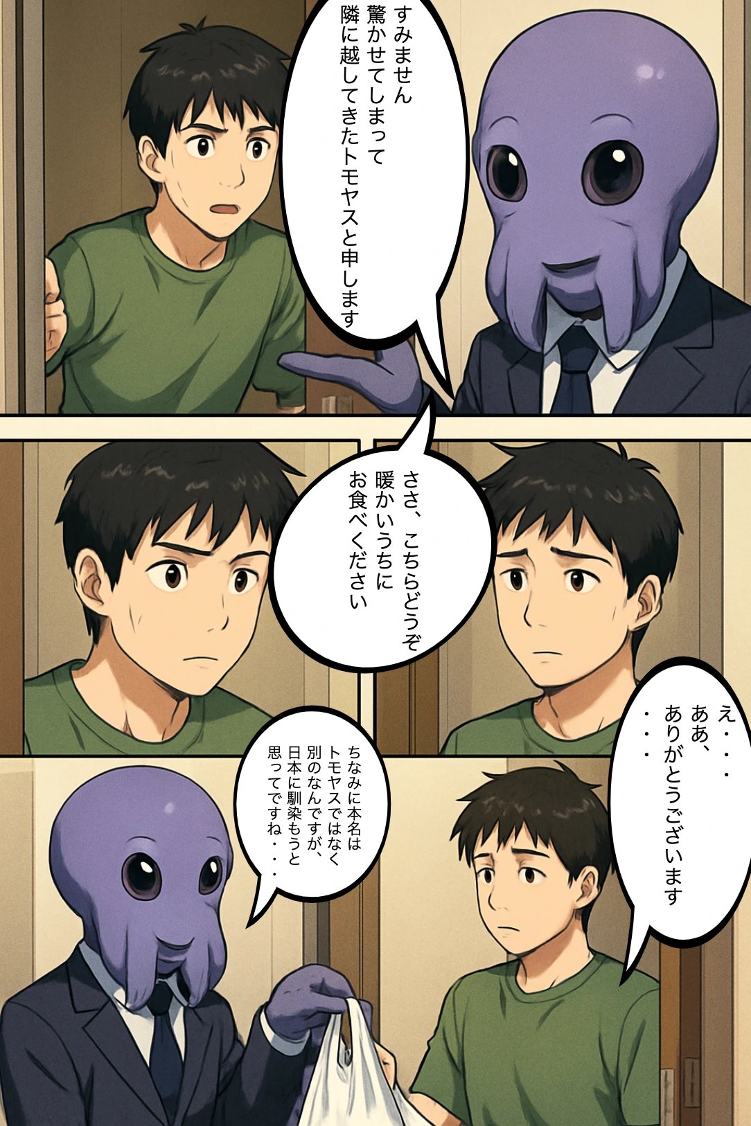 健斗(モノローグ)「今日から新しい生活が始まるんや…!」 インターホンが鳴り、健斗「え、誰やろ?」 ドアを開けるとトモヤス「すみません、驚かせてしまって。隣に引っ越してきました。トモヤスと申します。」