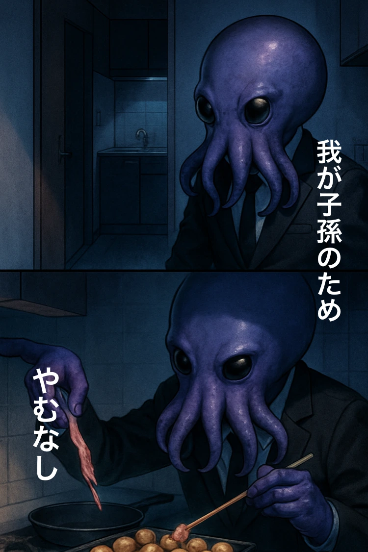 トモヤスは暗い部屋で自分の触手を材料にたこ焼きを作っている