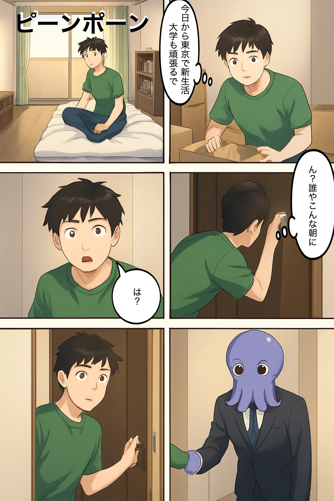 健斗の新生活スタート、初めて隣人と対面する朝の玄関前。
