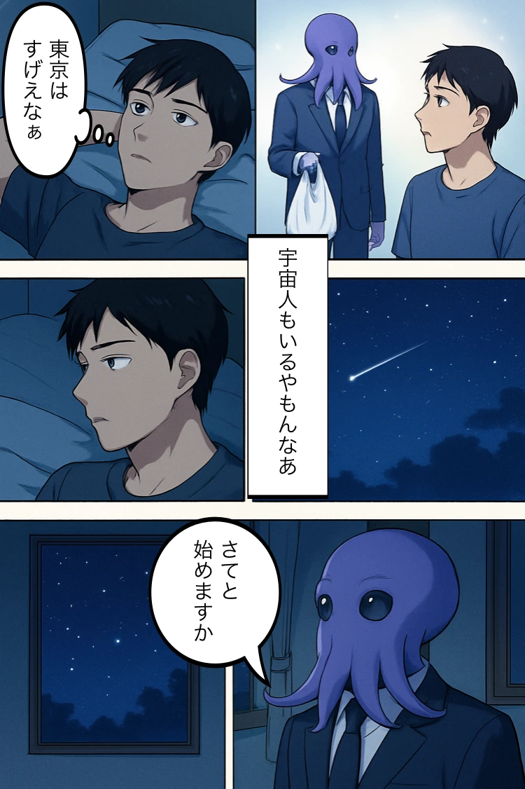 健斗(モノローグ)「今日はいろんなことがあったな…」 健斗(内心)「地球にも…いや、俺の隣にも、いろんな存在がおるんや」 トモヤス「地球、良い星だな…」