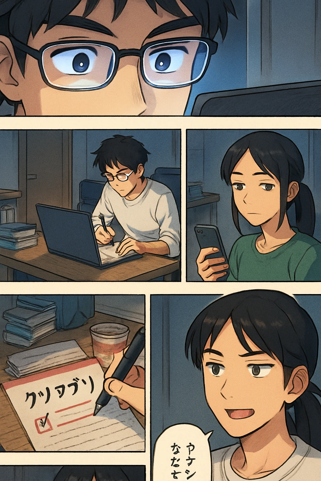 タケシは深夜、部屋で新しい『クソアプリ』のアイデアを思いつく。ミホは呆れつつも、タケシの熱意に少し笑ってしまう。「また変なこと考えてるの?」「今度こそ面白いアプリ作るんだ!」二人のやりとりが軽快に始まる。