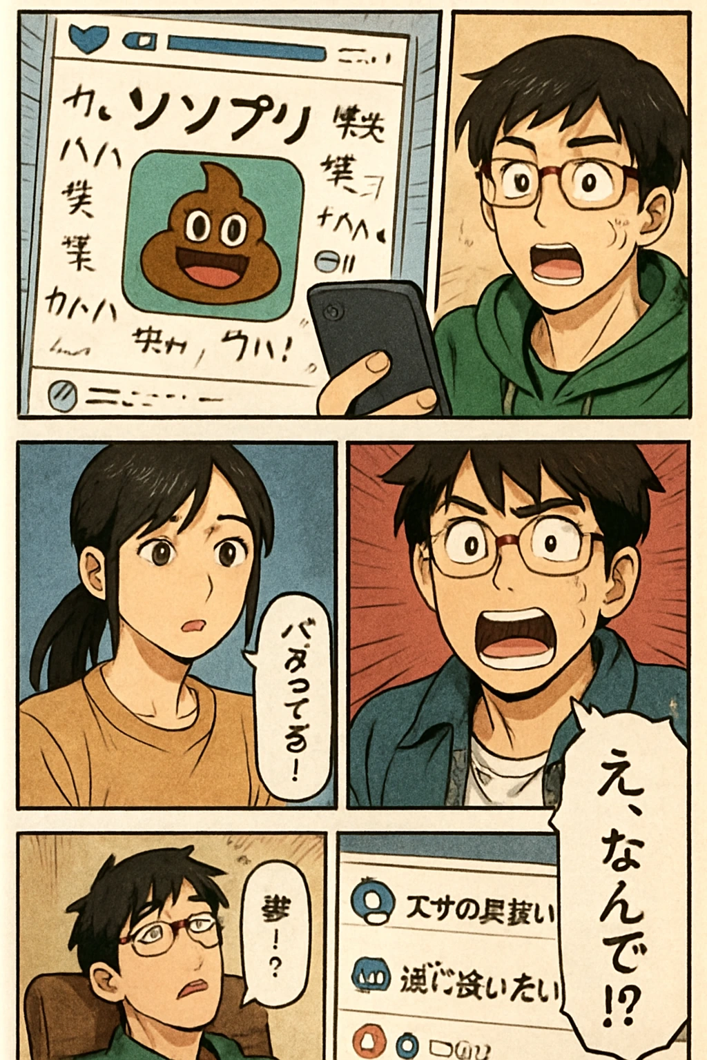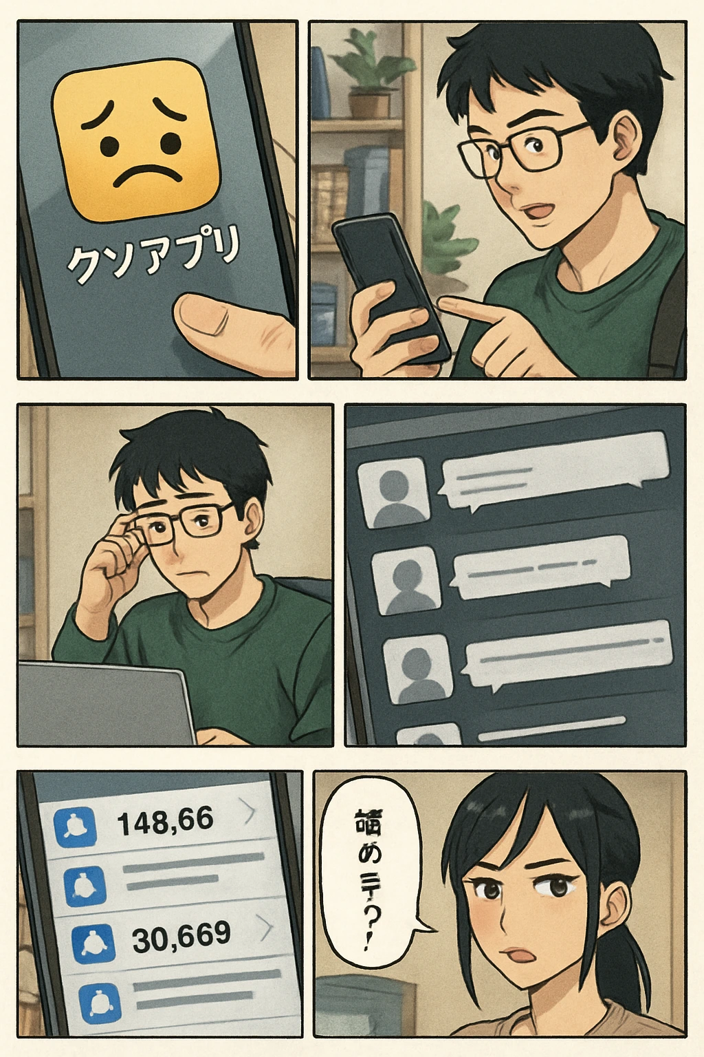 二人は成功を祝うが、SNSで新たなクソアプリのニュースが舞い込む。タケシは「…まだ終わってないかもな」と静かに決意を新たにする。