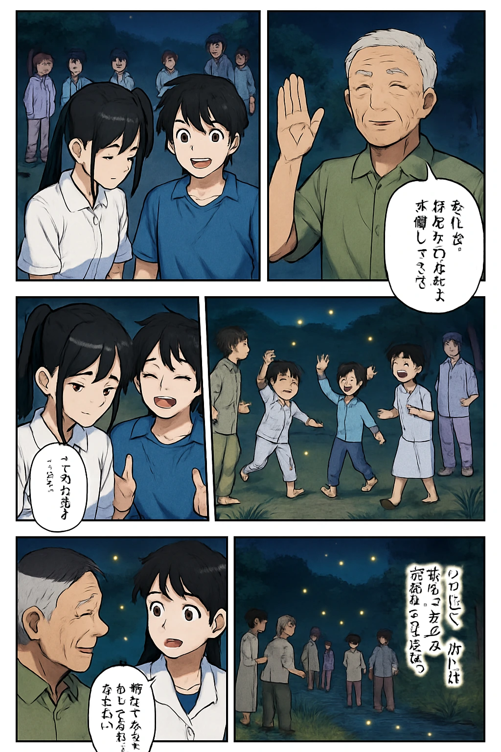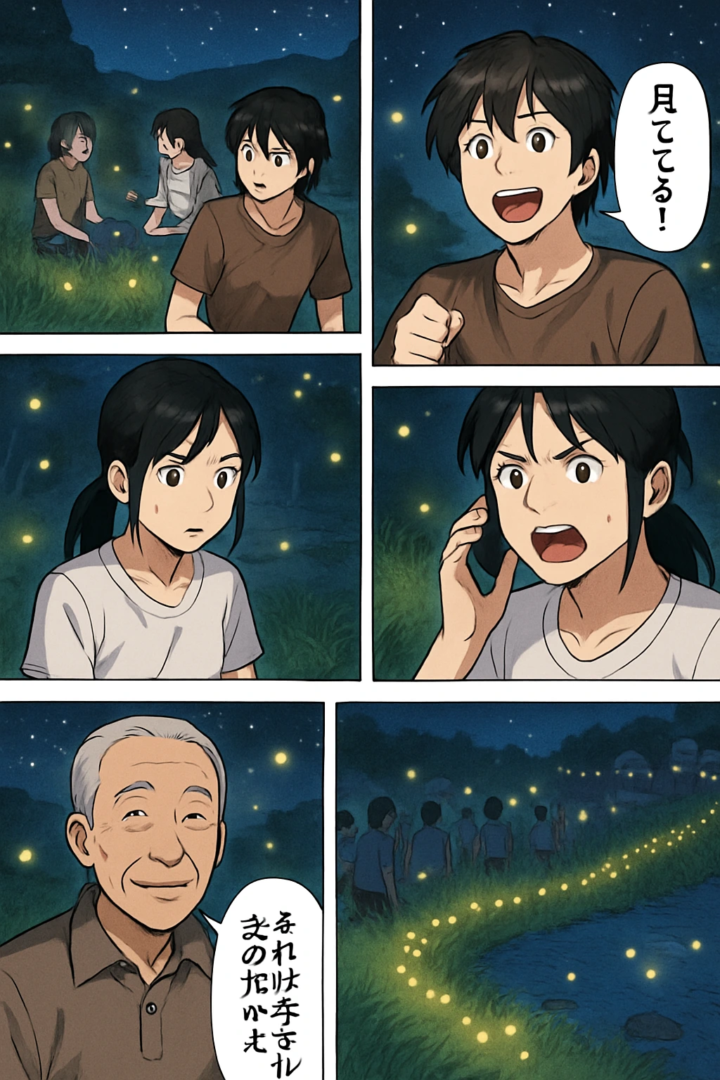 一郎「みんな、これはホタルの光だよ。火事じゃないよ。」 美咲「ごめんなさい…」 翼「でも、こんなにたくさんの人が集まるなんて、すごいですね!」 村人「昔はみんなでホタル見たもんだ。」 ナレーション「こうして、村には新しい夏の夜の伝統が生まれた。」