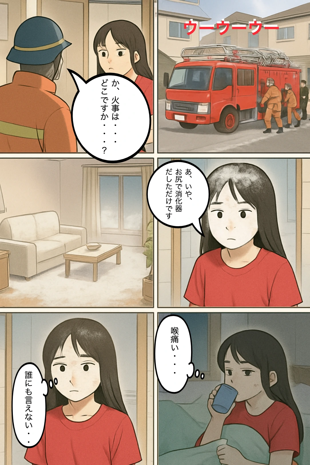 消防士:「どこが燃えてますか?」 お母さん:「すみません、消火器の粉が…」 佐藤さん:「本当にすみません!」 (さなえはひたすらうがい) さなえ(心の声):「こんなの絶対誰にも言えない…」 さなえ:「うええ、苦い…」