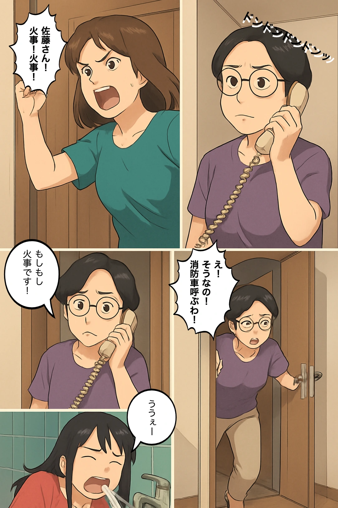 お母さんが佐藤さん宅へ駆け込み、火事だと勘違いして119番通報。消防車のサイレンが響き渡る。