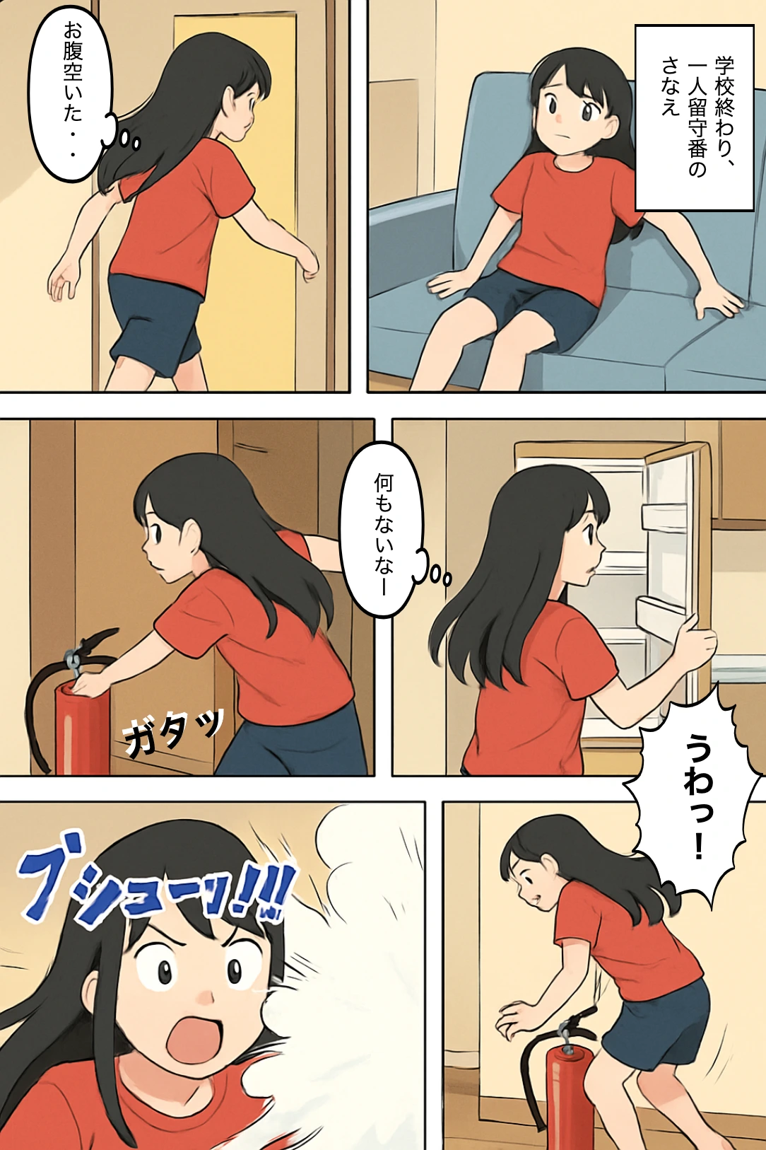 さなえ(心の声):「お腹すいた…おやつ、どこだっけ。」 さなえ:「あれ?こんなとこに消火器…」 (バランスを崩して) さなえ:「えっ、なにこれ…?」 (消火器のレバーをお尻で押してしまい…) 「ブシューッ!!」 さなえ:「うわあああ!何これ!?」