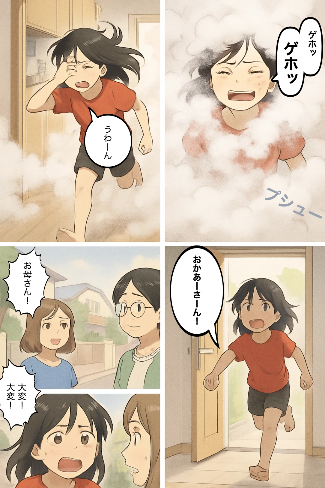 さなえ:「ゲホッ、ゲホッ…目が、目が痛い!」 さなえ(心の声):「このままじゃ、死んじゃうかも…!」 (外に飛び出し、必死に) さなえ:「大変!大変!」 お母さん:「さなえ、なにがあったの?」 さなえ:「大変!大変!」 お母さん(心の声):「まさか火事…!?」