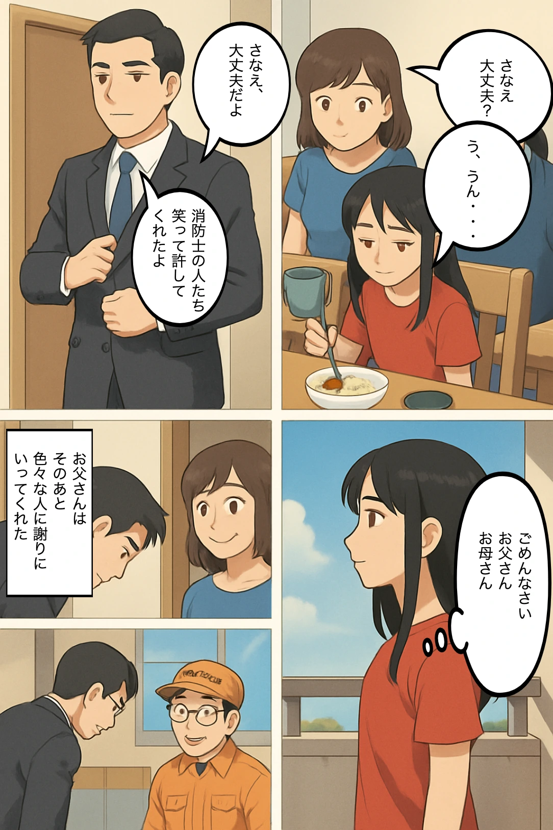 お母さん:「さなえ、大丈夫?」 お父さん:「消防署の人、笑って許してくれたよ」 さなえ(心の声):「もう二度とこんなことしない…」 家族:「あの時は大変だったね!」 さなえ(小声):「もう、笑い話にしないで…」