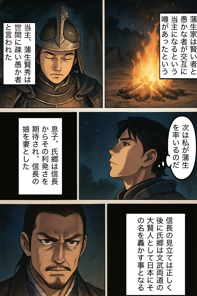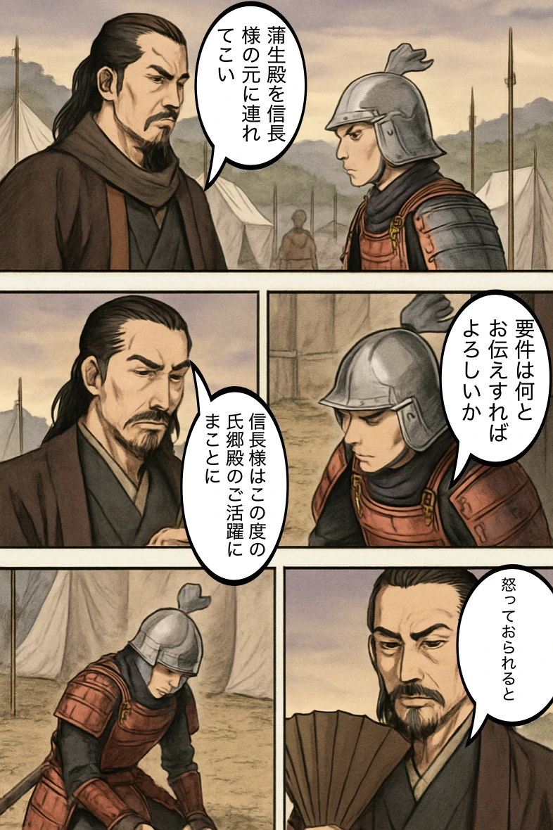 戦後の陣営、信長と氏郷の対話。
