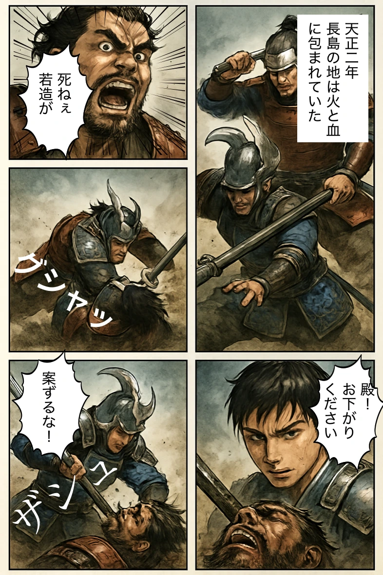 モノローグ:「天正二年、長島の地は火と血に包まれていた。」 氏郷(心の声):「敵の大将を討ち取れば…我が名も天下に響く!」 家臣:「若殿、お気をつけください!」