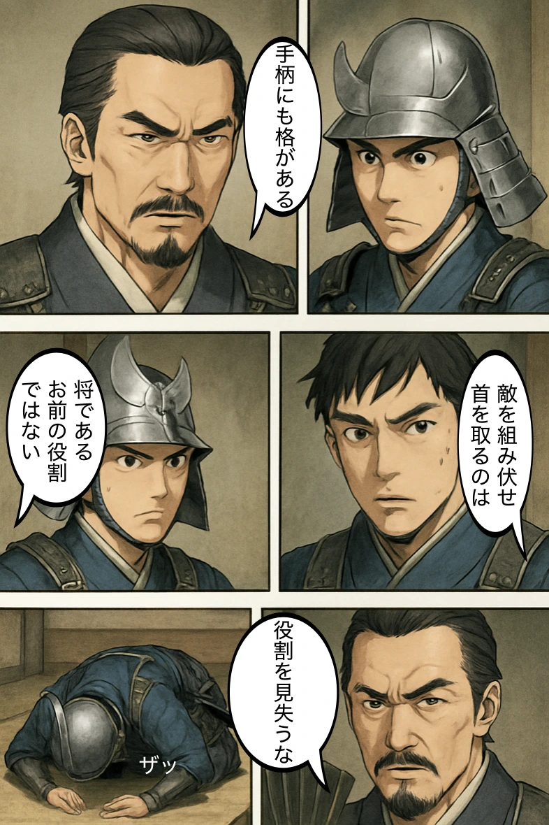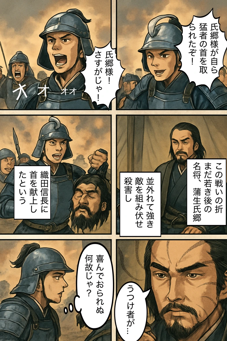 家臣:「若殿が敵の大剛を討ち取ったぞ!」 氏郷:「織田様、この首、敵の勇将にございます!」 モノローグ:「称賛の言葉は、ひとつもなかった。」