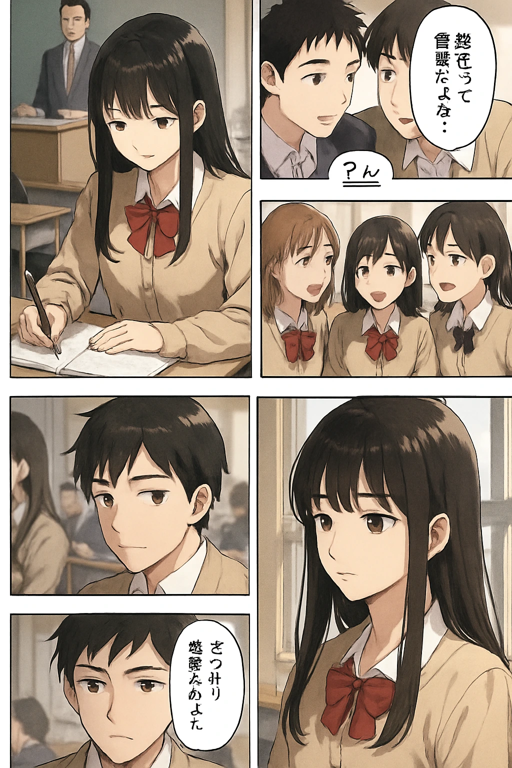 教室中が彩花に注目し、ざわめく。「彩花ちゃん、今日も可愛い!」と女子が囁き、男子も頷く。直樹(心の声)「なぜだろう、何かが違う気がする…」