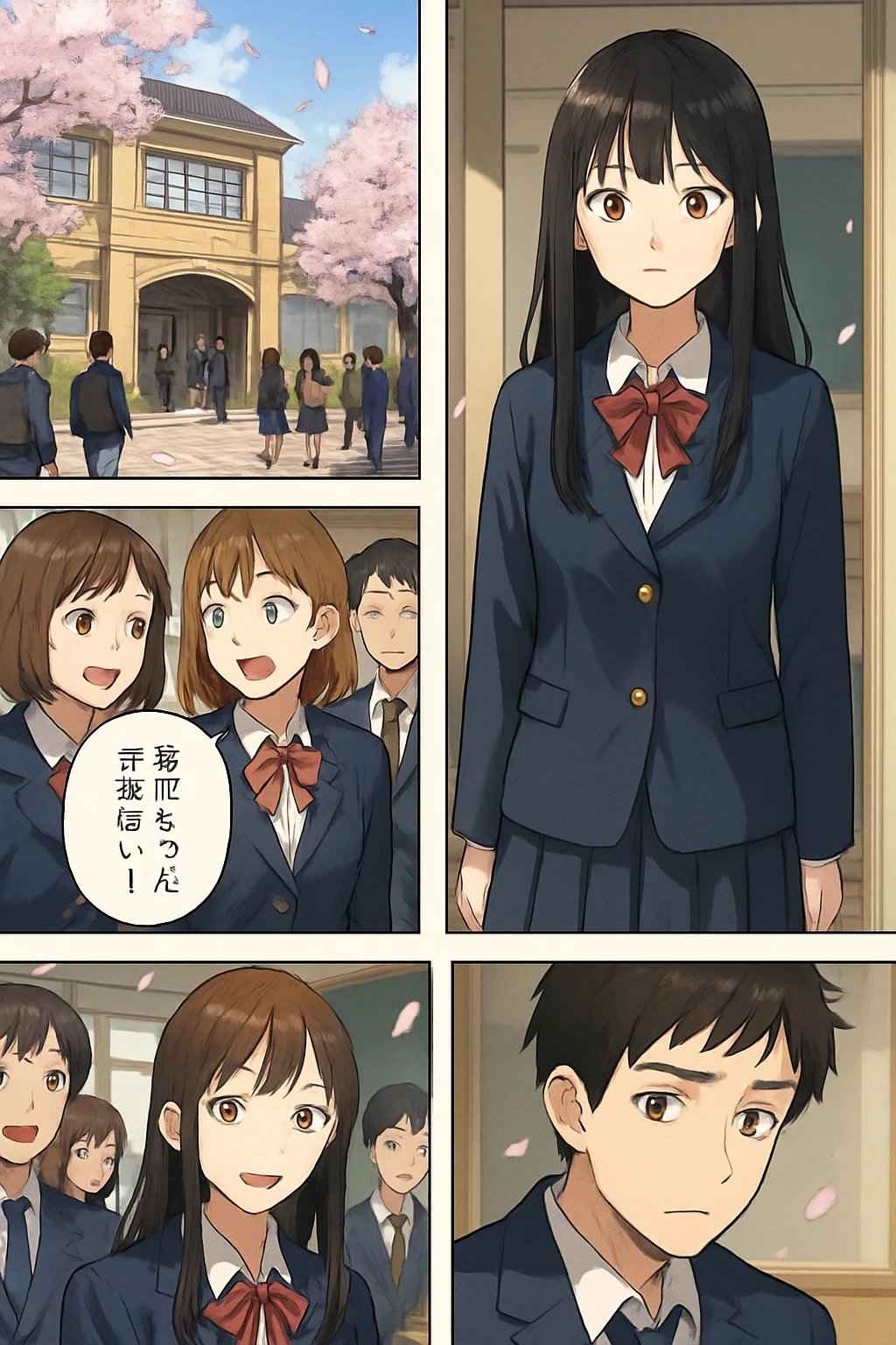 春の朝、桜舞う校門と新学期の教室で彩花が初登場。