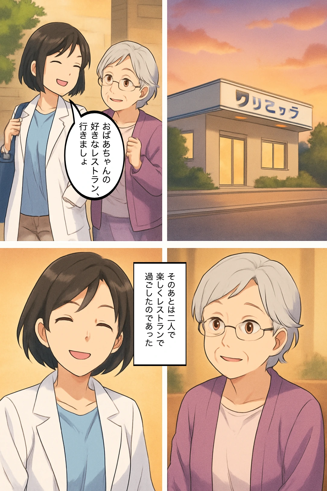 千代「また来てもいい?」 彩乃「もちろん、おばあちゃん!」 (ナレーション)「あの日のドキドキは、今でも笑い話です。」 レストランに入り、談笑する二人