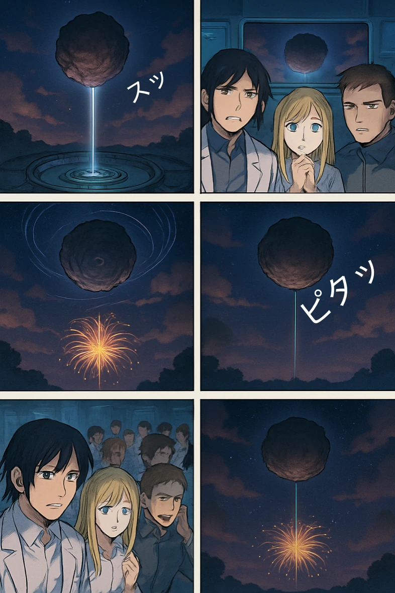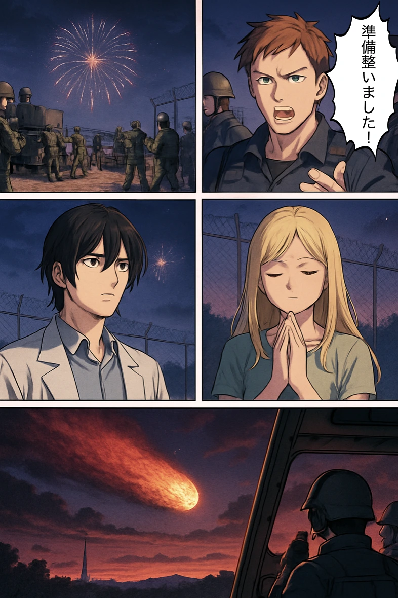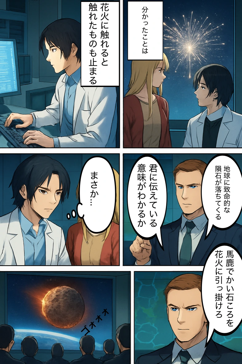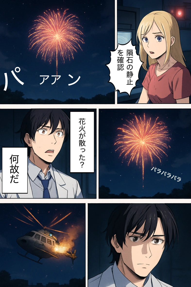 美咲:「あの花火、本当に止まったままなのね……」 翔太:「10年経っても、何も変わらない。だが、必ず突破口はあるはずだ。」 翔吾:「隕石の衝突まで、残された時間はわずかだ。作戦開始の準備を。」 ナレーション:「人類最後の賭けが、始まる。」