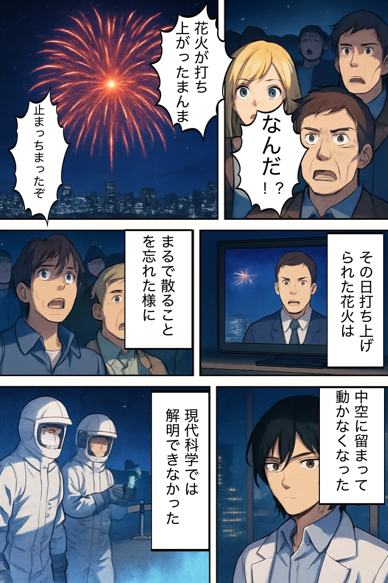 ナレーション:「あの日、夜空に打ち上げられた最後の花火は、時を止めた。」 人々:「……」「どうして動かないんだ……?」 テレビ:「政府は直ちに一帯を封鎖、『静止領域』と命名しました。」 翔太(心の声):「この謎を、必ず解明してみせる――」