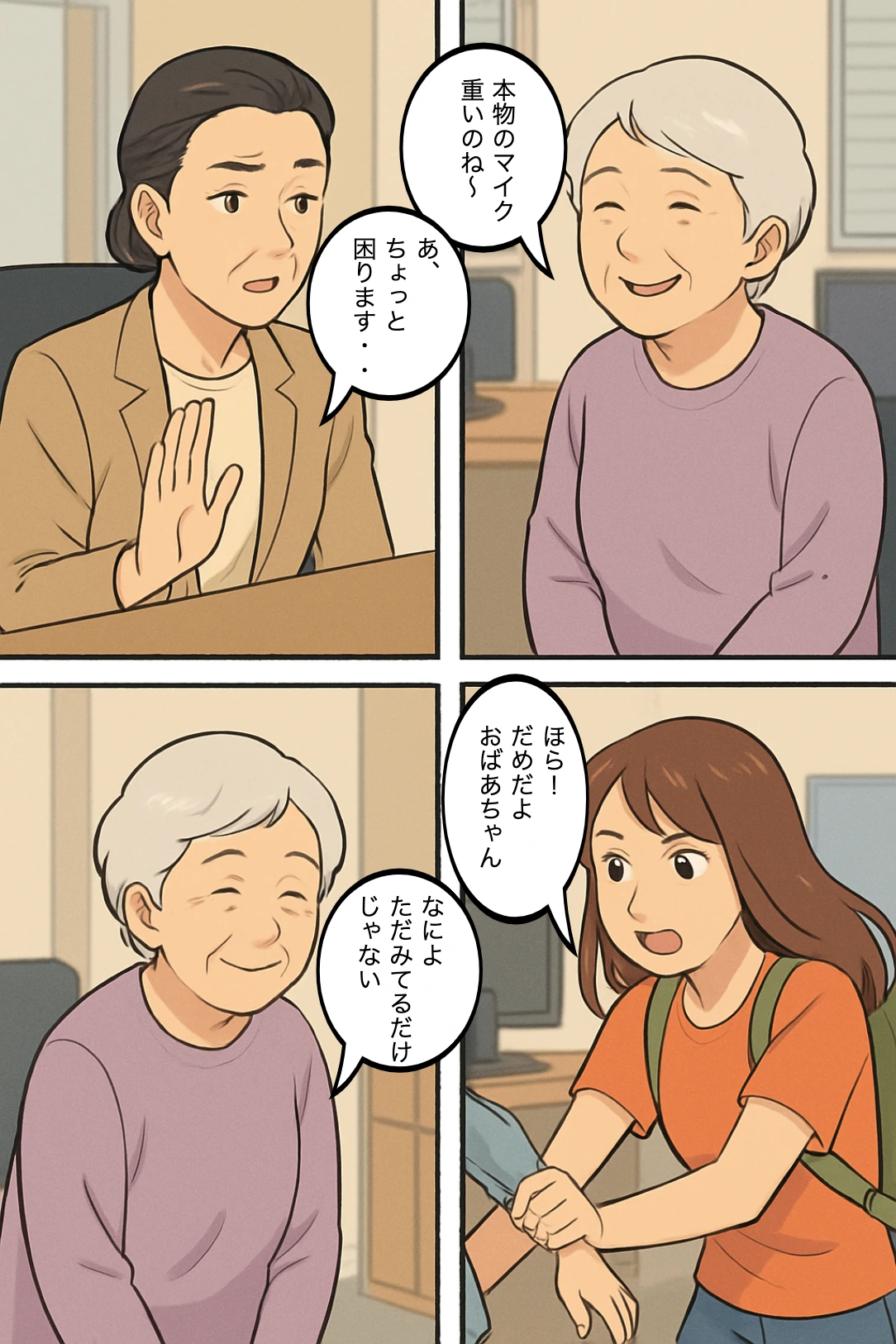 デスク前でおばあちゃんとのり子さんが会話、さなえが必死にその場を収めようとする。