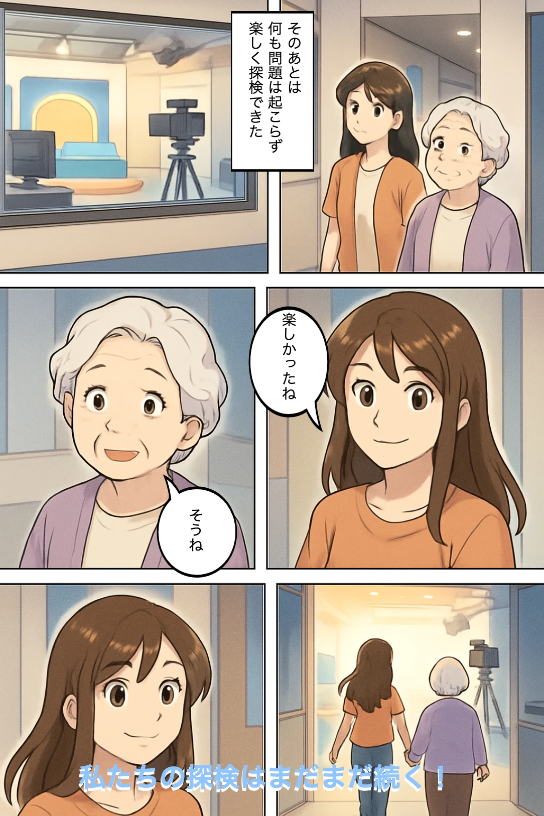 さなえ「おばあちゃん、次はあのスタジオ行ってみよう!」 おばあちゃん「いいねえ、どんな出会いがあるか楽しみだね」 ナレーション「さなえとおばあちゃんの冒険は、まだまだ続く!」