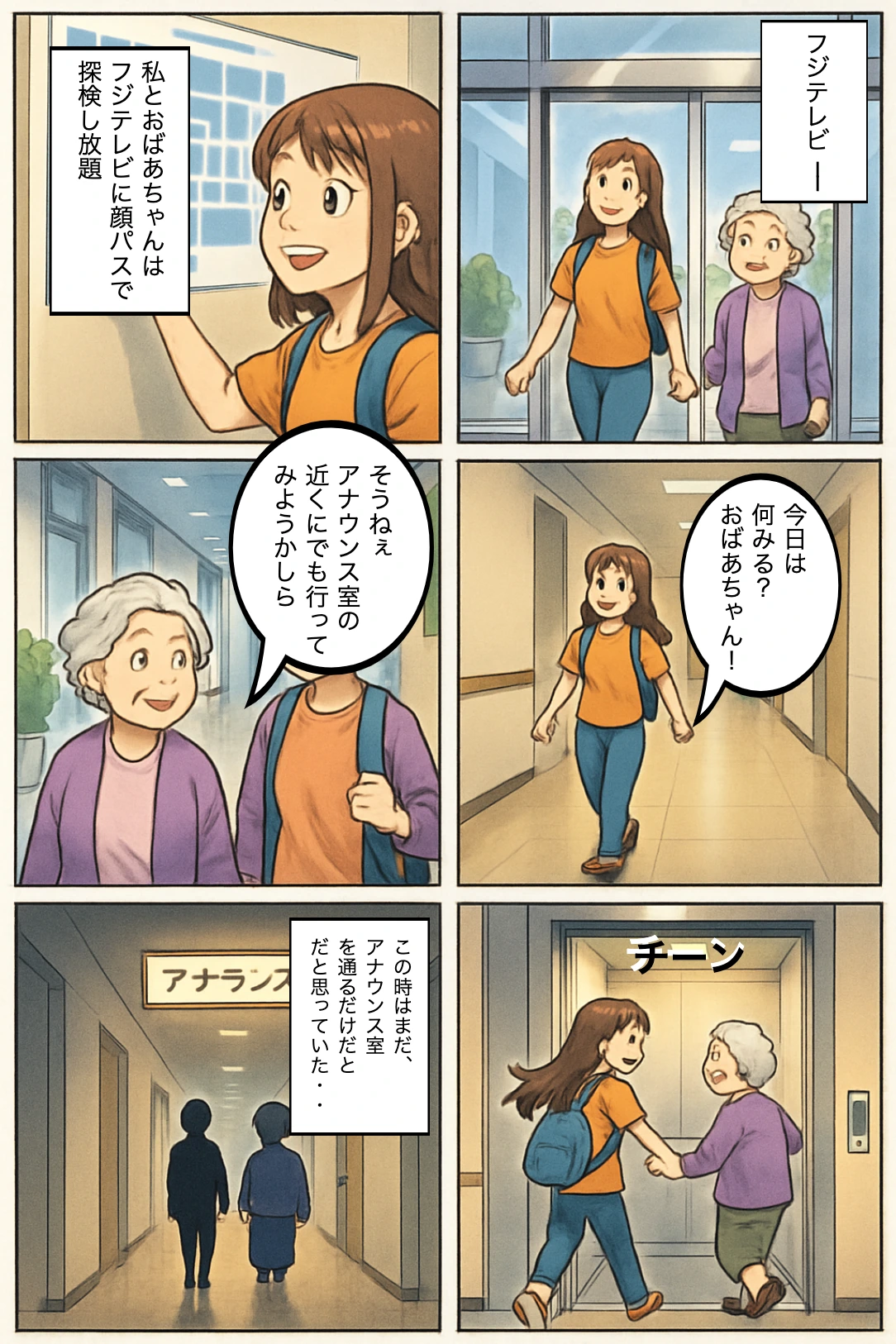 さなえ(心の声)「おばあちゃんとテレビ局探検。今日はどんな発見があるかな?」 おばあちゃん「さなえ、こっちも見てごらん!」 さなえ「顔パスって、なんだかドキドキするね!」