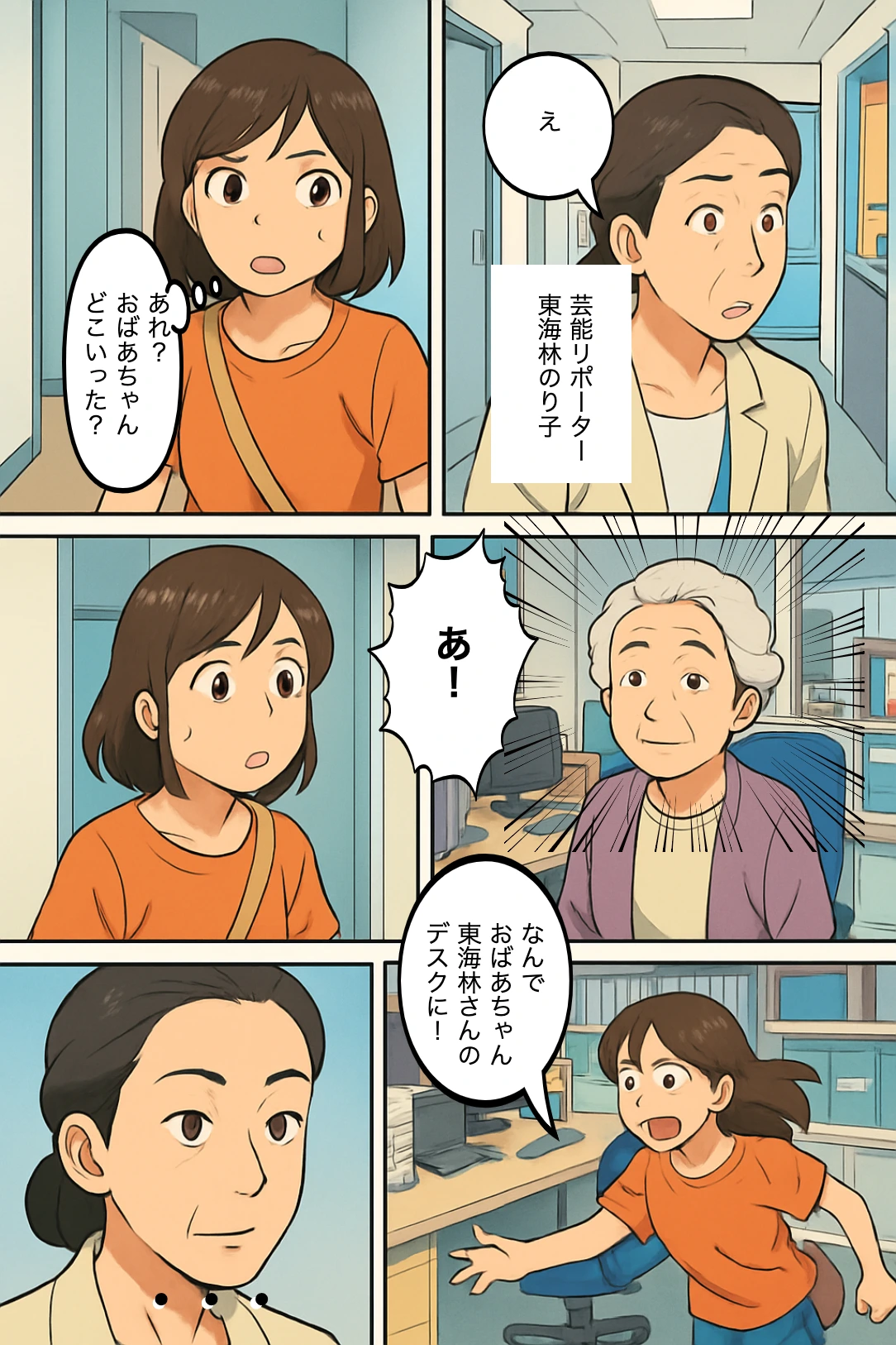 2階アナウンス室前でおばあちゃんが突然消えてのり子さんのデスクに現れる。